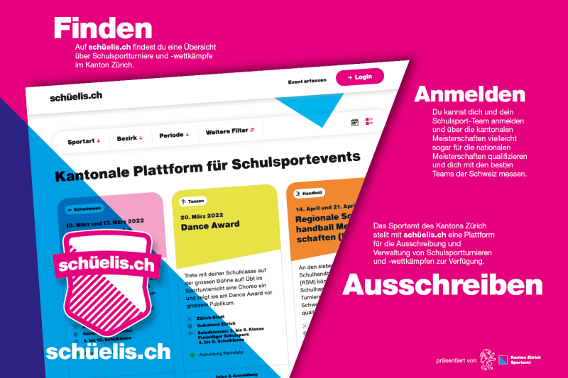 Das Sportamt stellt mit schüelis.ch eine kantonale Plattform für die Ausschreibung und Verwaltung von Schulsportevents zur Verfügung. Lehrpersonen, Schülerinnen und Schüler sowie Eltern können sich auf schüelis.ch über das grosse Angebot an Turnieren und Wettkämpfen im Kanton Zürich informieren und Schulsport-Teams anmelden. Die Teilnahme an den Schulsportevents sind ein Highlight für jede Klasse und ein ideales Trainingsziel für den Sportunterricht.